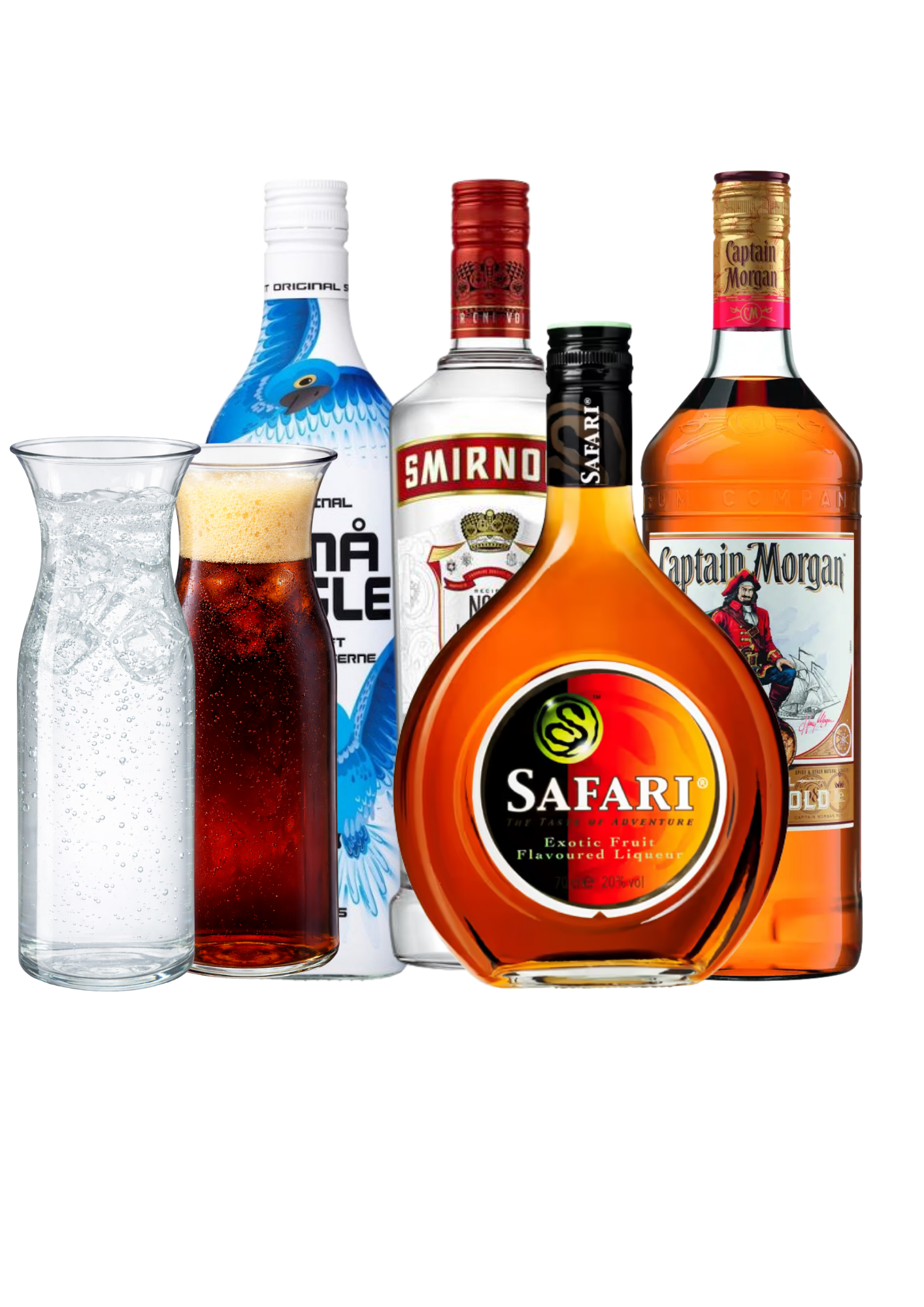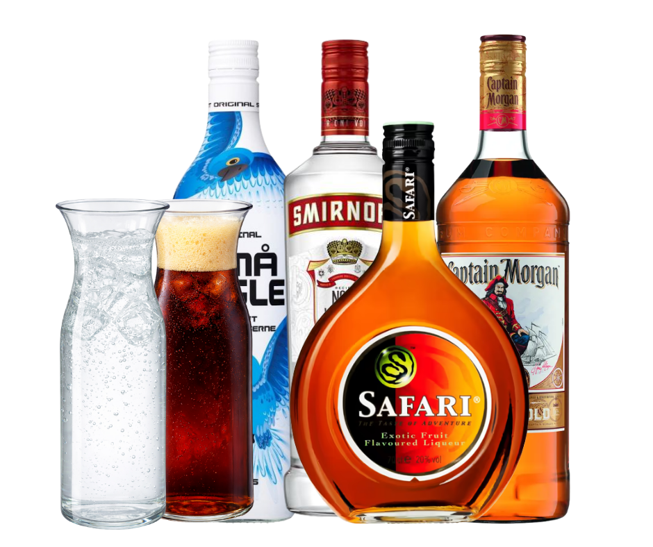 Vælg bla. mellem Morgan, Safari, Gin, Vodka, Bacardi Razz, Jack Daniels, Cola, Sprite, Red Bull eller andet