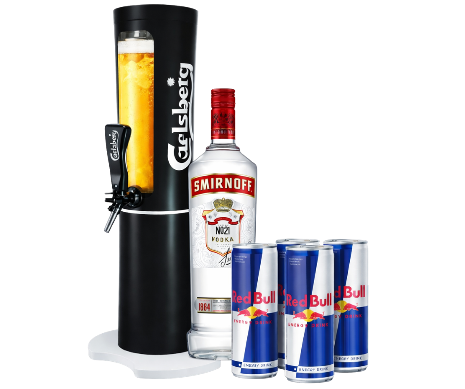 3 L fadøl, 1 Flaske Smirnoff Vodka, 4 Redbull